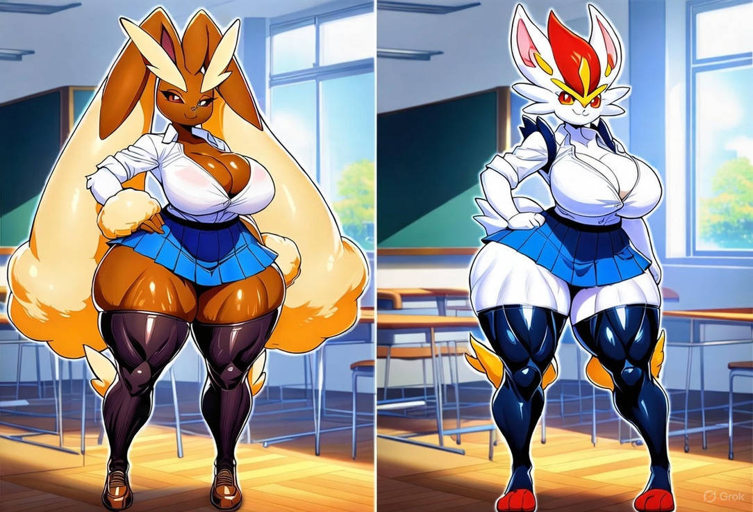 Lopunny strode confidently across the bustling campus of her new school, dressed in an outfit that did little to conceal her striking physique: sheer thigh-high stockings that utterly failed to hide her thick, muscular thighs; an ultra-short skirt that barely covered her powerful, perfectly rounded rear and fluffy tail; and a long-sleeved top—sleeves rolled up to her forearms—with a plunging neckline that hugged her full, beautiful breasts snugly.