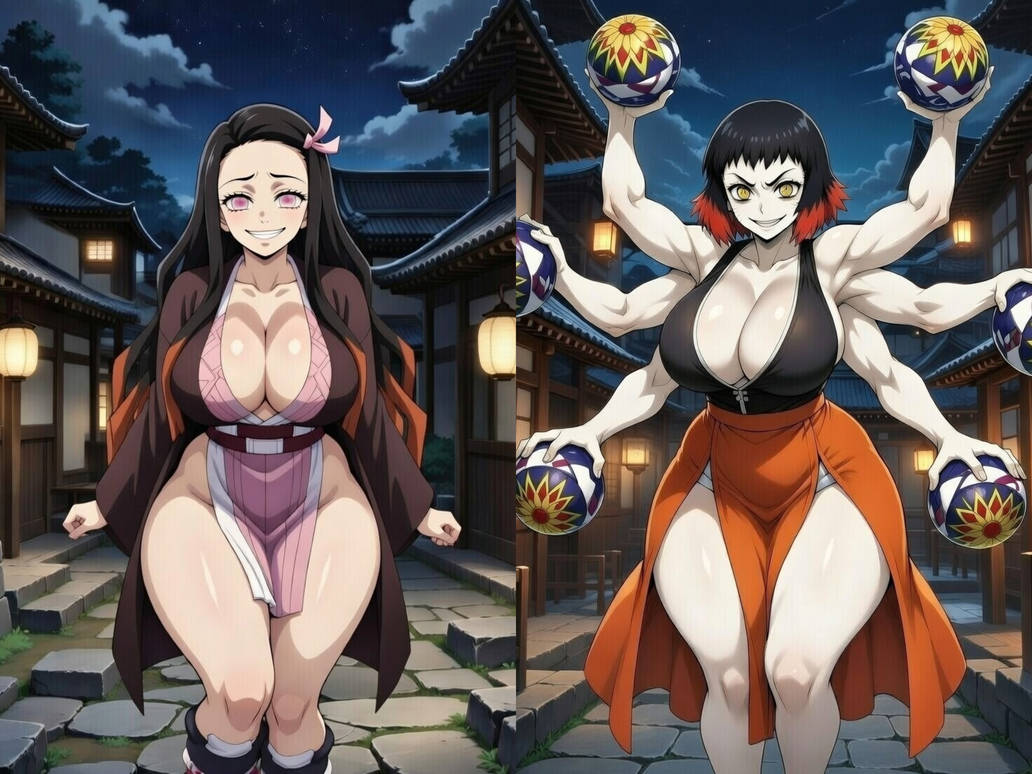 The carnage continued. Nezuko regrew hers and ripped off Susamaru’s right breast with her bare hands. Susamaru regrew and tore off Nezuko’s left. Soon Susamaru resumed using her temari, hurling them at Nezuko’s chest while Nezuko batted them back toward Susamaru’s—destroying and regenerating breasts endlessly as the balls ricocheted wildly off the walls.
