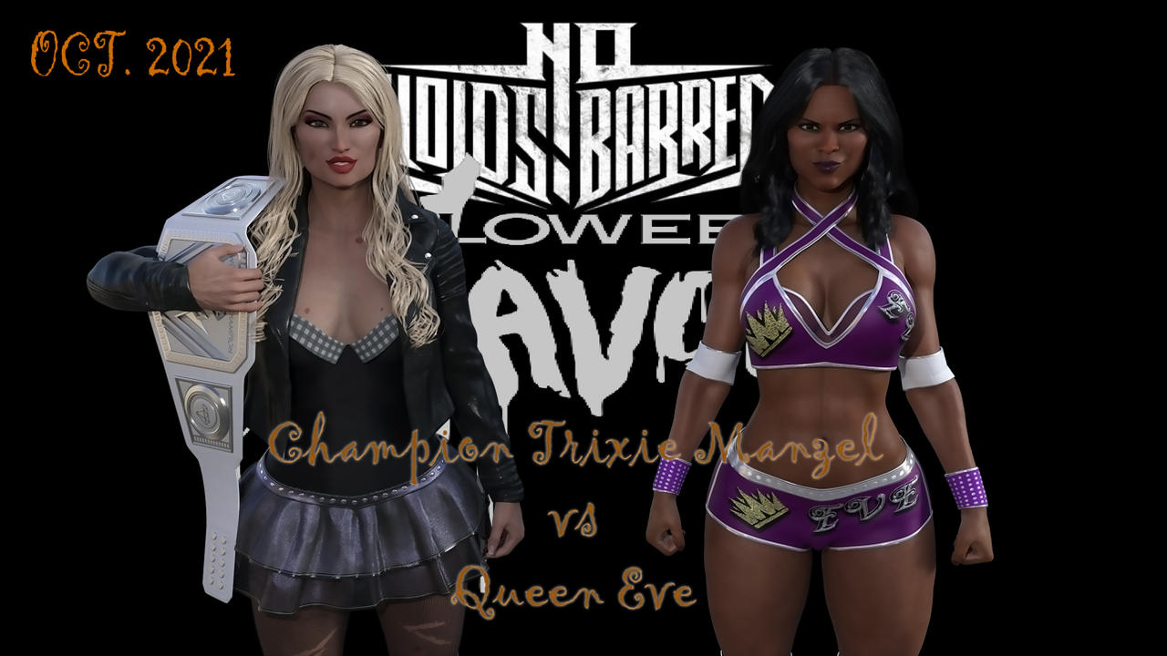 Eve is jumping up and down as she awaits Trixie, the champ, to make her appearance. The music hits and the lights go out as the strobe lights flash. Trixie, a baby face in this match as well, is excited as she dances around the ramp with the belt around her waist. She smiles and points at the audience as she rushes down the entrance. She high fives fans as they cheer. Happy Halloween and Trixie loves this holiday. The back of her jacket reads, "Trix or Treat".