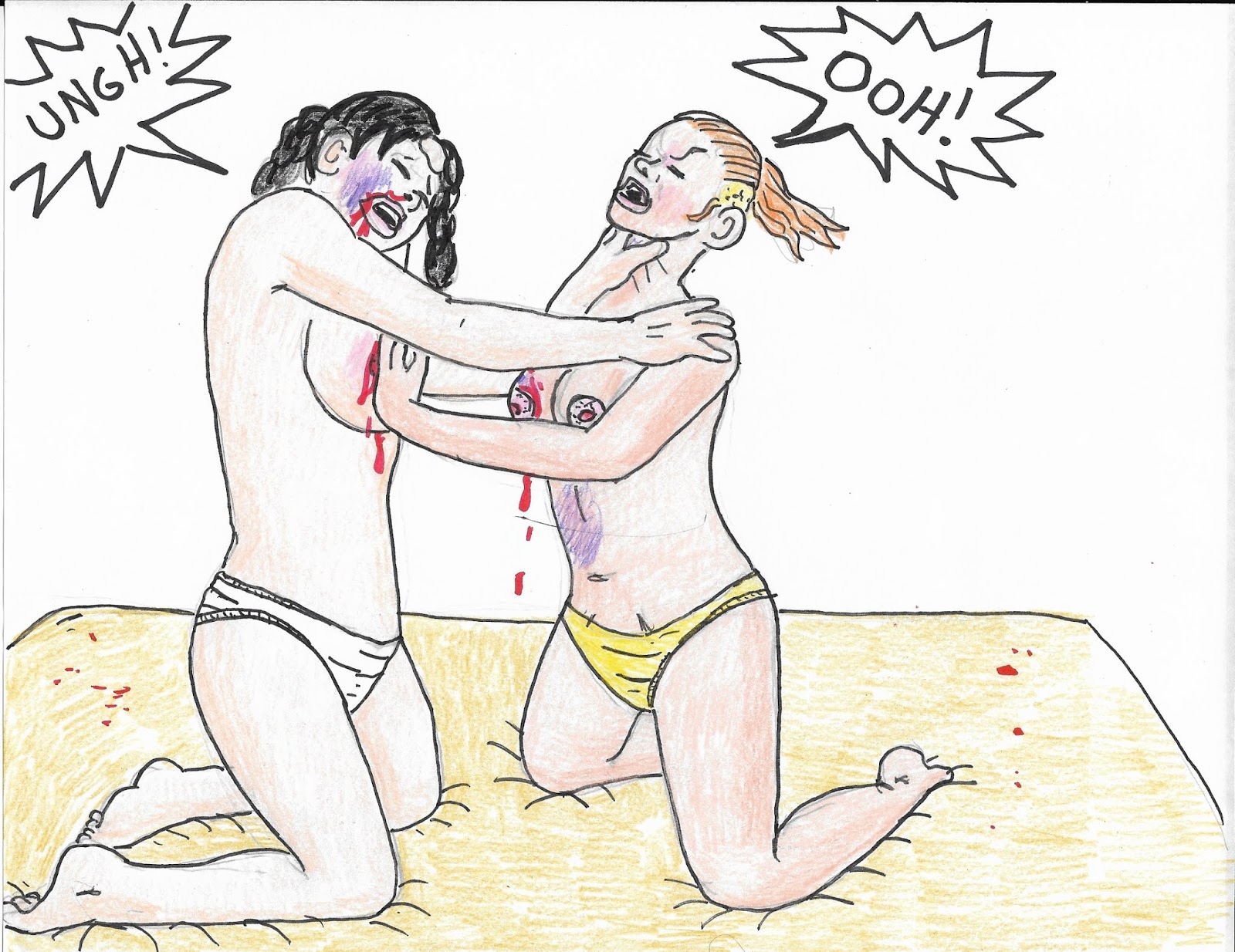 It's the third fight of the second round of a 16 girl elimination tournament at The Mat Club. Sing Li (in white) challenges Liz (In yellow) to take off her foot wear and fight in just panties, to the death! Liz happily accepts the challenge.