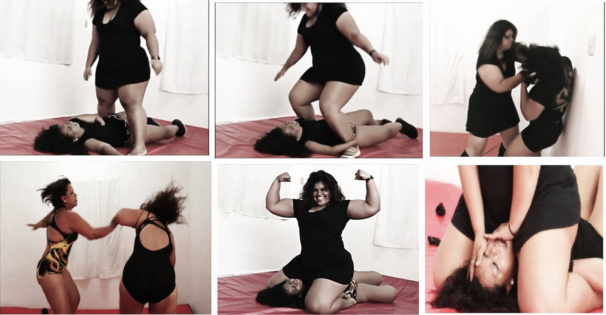 A new Artificial Intelligence essay over te video where two aggressive latin señoritas wrestle, catfight, schoolgirlpin and when the sgpin is conquered, one dance and bounce on top of the other until the final victory flexing arms.