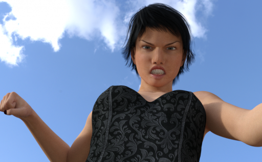 She attacks low with a low roundhouse kick, aiming at Beth's knee. She is quick as a rabbit and raises her leg and it misses.