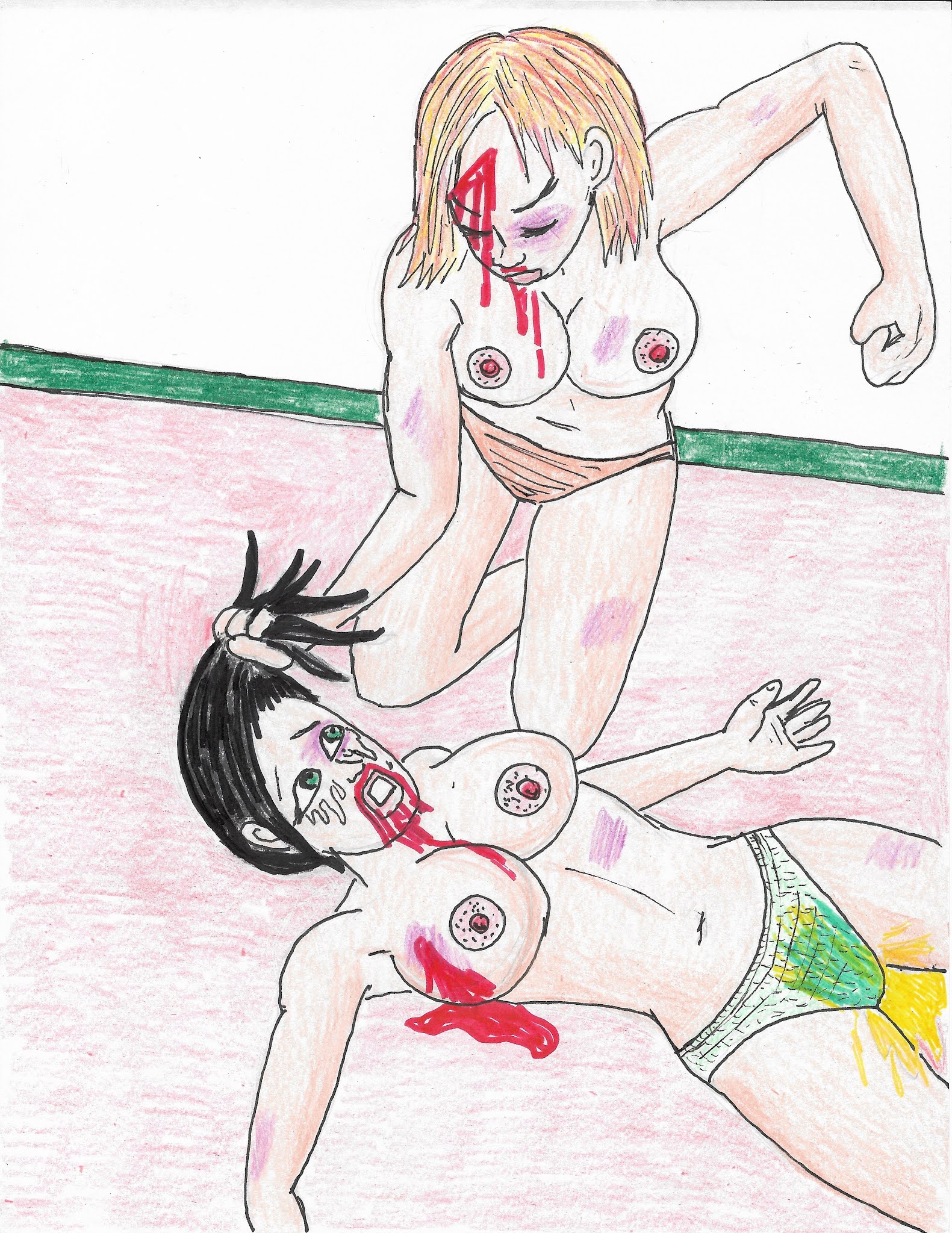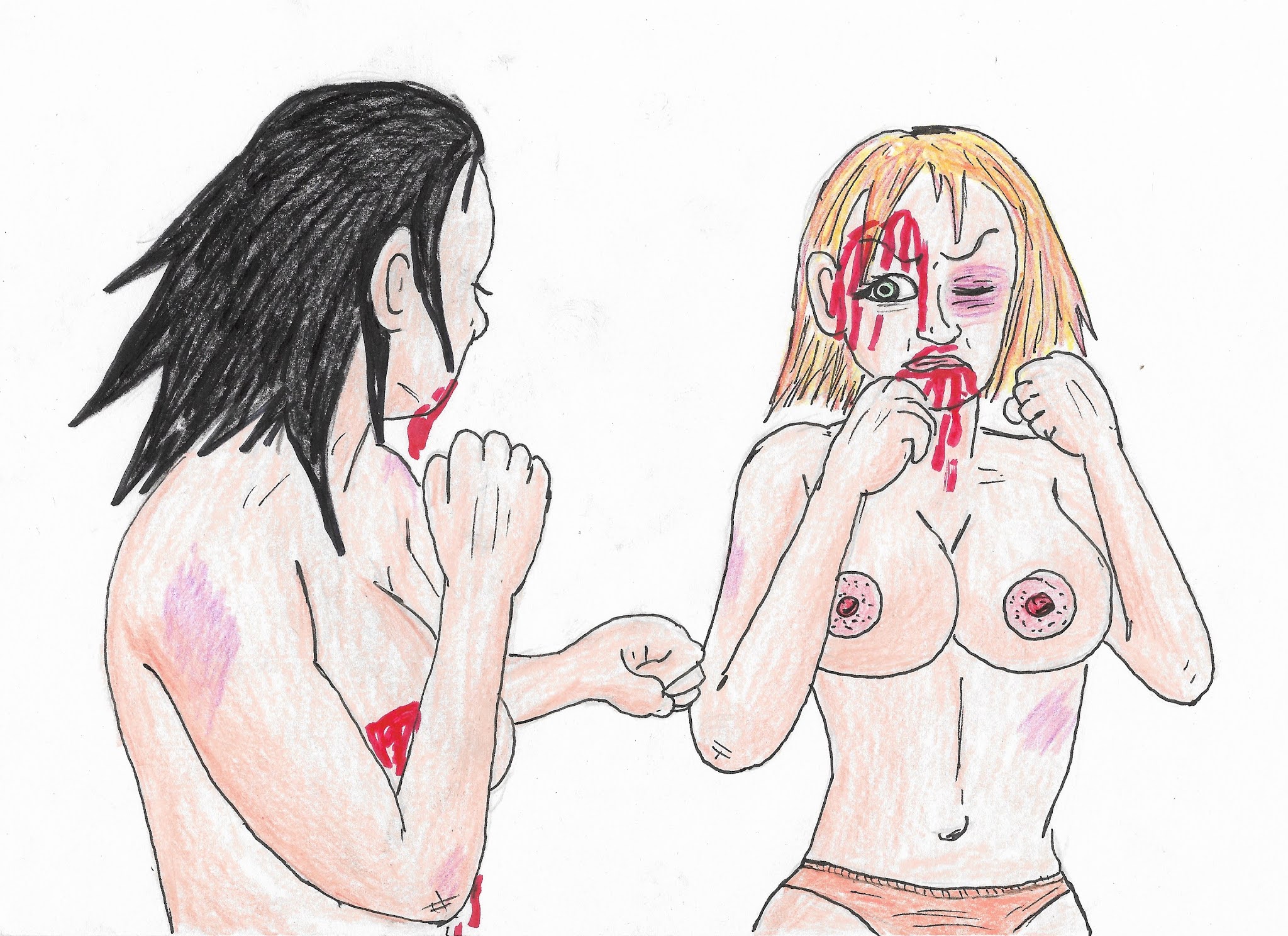 Misty staggers back and watches as Harmony stumbles around moaning in pain.  She waits patiently for my raven-haired girlfriend to regain her composure, then she slowly raises her fists, wordlessly beckoning Harmony to continue the fight.  After a few seconds of whimpering, she finally shakes it off and raises her own fists.  Slowly the two women, now bloodied, bruised, and gasping in exhaustion, begin to circle.  No more words are exchanged.  My heartbeat is at a dull throb.  I can sense that one way or another, this fight is almost over.
