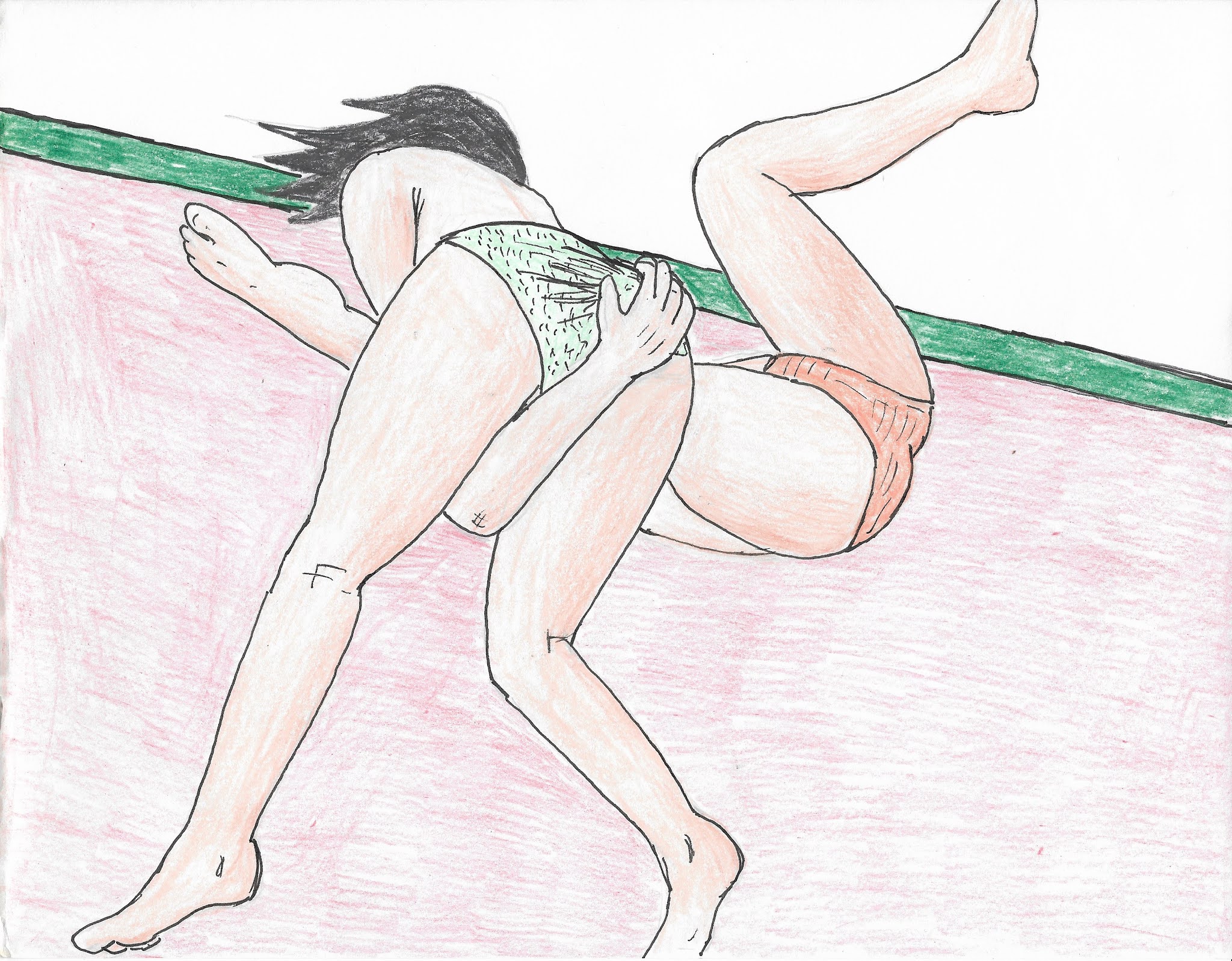 Misty keeps sitting on her vanquished foe’s face, her own breasts rising and falling rapidly as she catches her breath and cools down from her quick sudden victory.  Finally panic sets in.  She’s going to kill her!