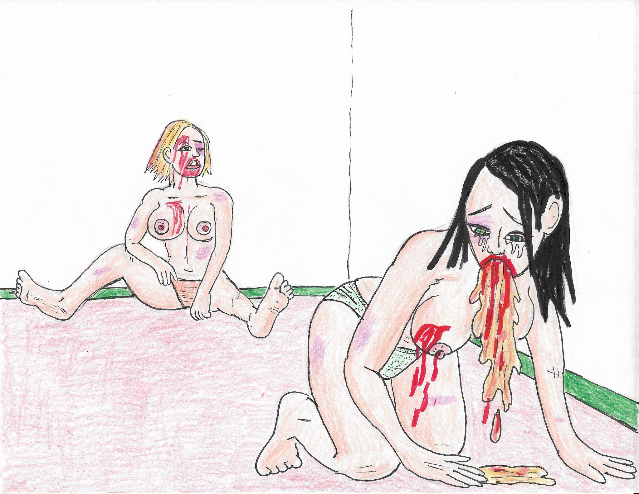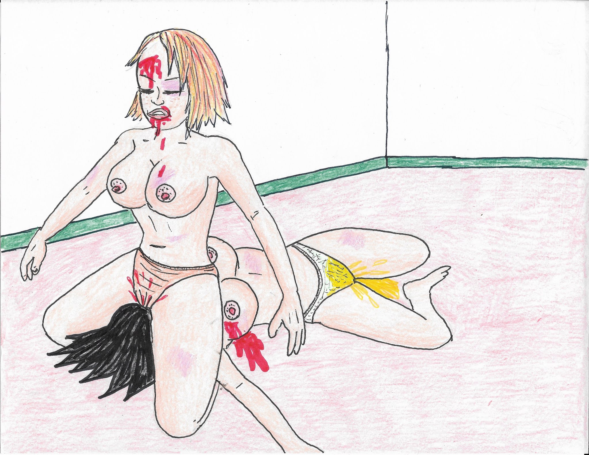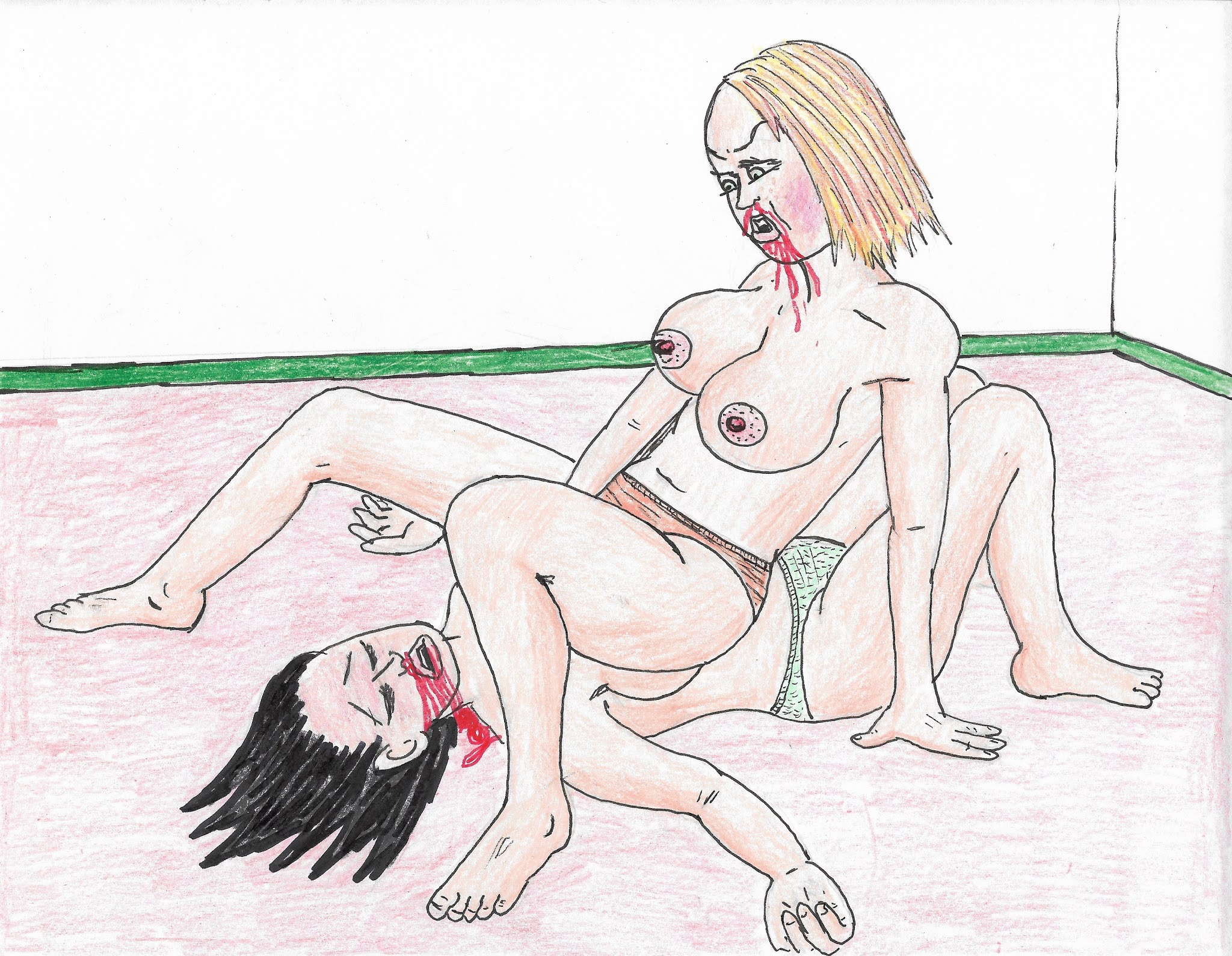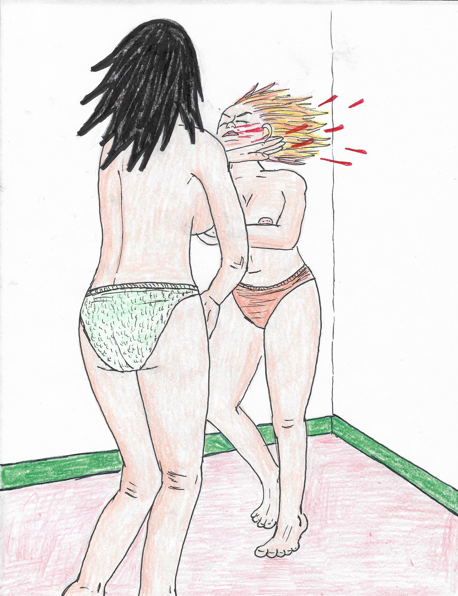“I’M GOING TO FINISH YOU!”  Misty howls and yanks Harmony across the room by the hair,  She turns her over a few feet from where I am sitting anxiously on the edge of the bed.  Clearly she wants me to have a good view of Harmony’s destruction.  My poor girlfriend pisses herself in terror as she is rolled over.  Misty drills her in the face.