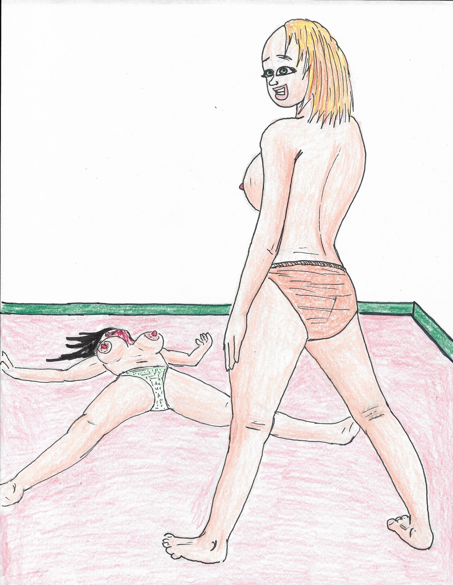 Then Misty stands up and places a foot on Harmony’s stomach.  She locks eyes with me as she raises her arms and flexes her muscles in a classic victory pose.  I know what she wants now.  I get up and go to her.  She holds her victory pose while we make out, pressing our bodies tightly together.  I look down at my mangled girlfriend, splayed out under Misty’s foot.  I feel bad for her, but I have NEVER been so horny in my life.  And after all, it was her idea.