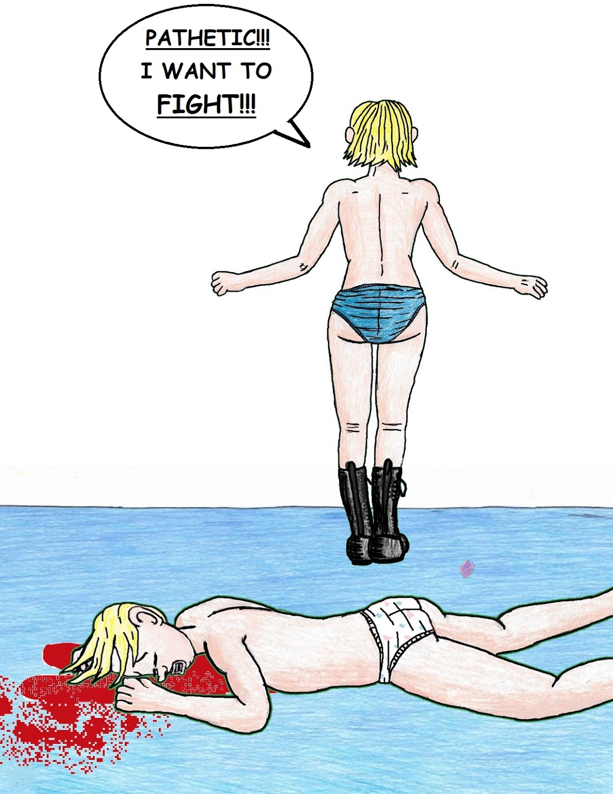 A very bored Heidi walks away from the vanquished Alyssa, who offered no challenge whatsoever to the brutal booted brawler.